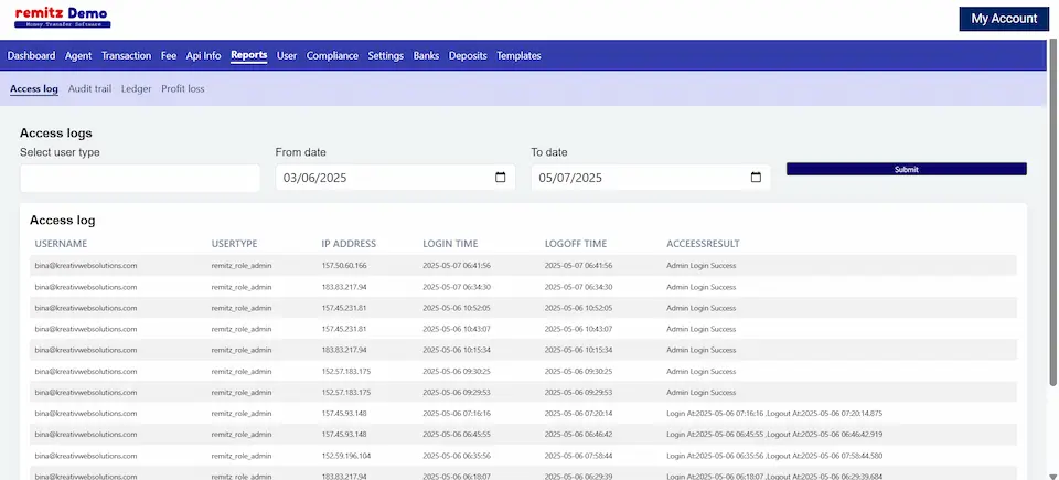Here we will be able to see when and from what ip address any person who is registered on the software is logging in. this included even the staff members with different roles.