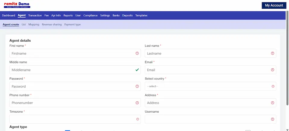 The agents will be created under a branch, nothing but a country, that agent can be a send or receive agent or bot send and receive agents. the send agent can make transactions and the receive agents can payout any transaction made by send agents.