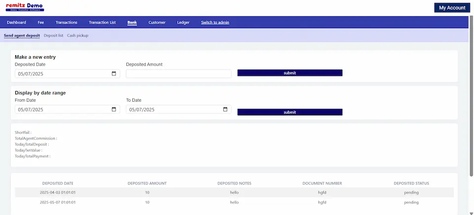 When agents make transactions, some part of the agent's collections needs to be deposited to admin or receiving agents. After depositing the entries are made from here and sent for approvel.