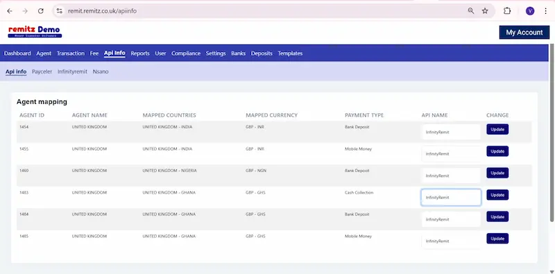 For every receiving agent, the money transfer system integrates various payment methods to provide secure and accessible money transfer services, including card payments, bank transfers, mobile wallets, bank deposit, cash collection, and mobile money or airtime top up. These can be enabled or disabled here.