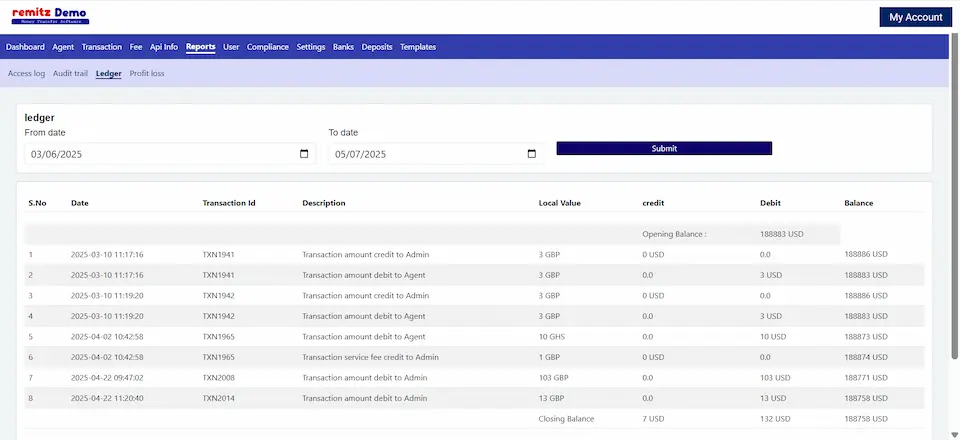Here the ledger is for any particular agent, allowing for the management of transactions in multiple currencies. We can see the balance here.