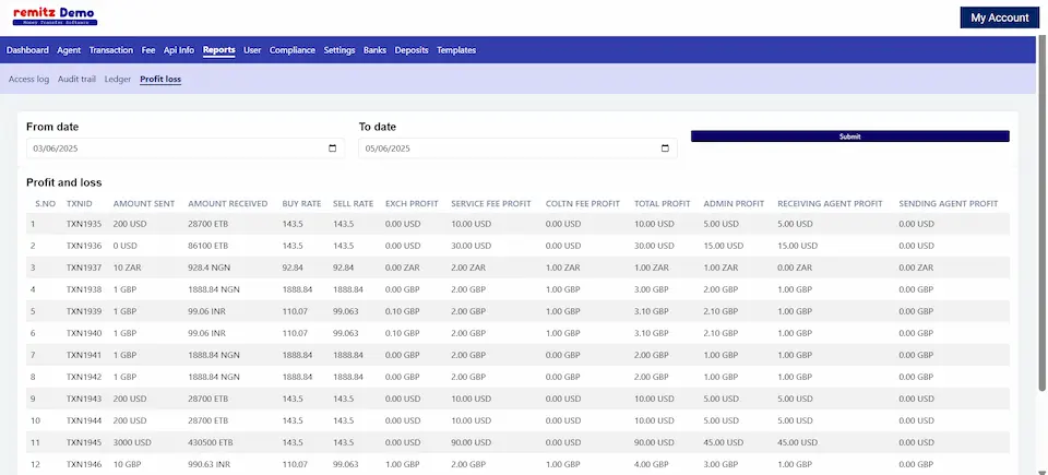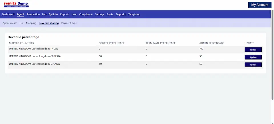 The software charges a service fee and that service fee can be distributed among send agent, receive agent and admin. the percentage share will be visible here. based on this when a transaction is made we will calculate the revenue and store it in respected tables. after which they can be easily retrieved and shown in profit and loss.