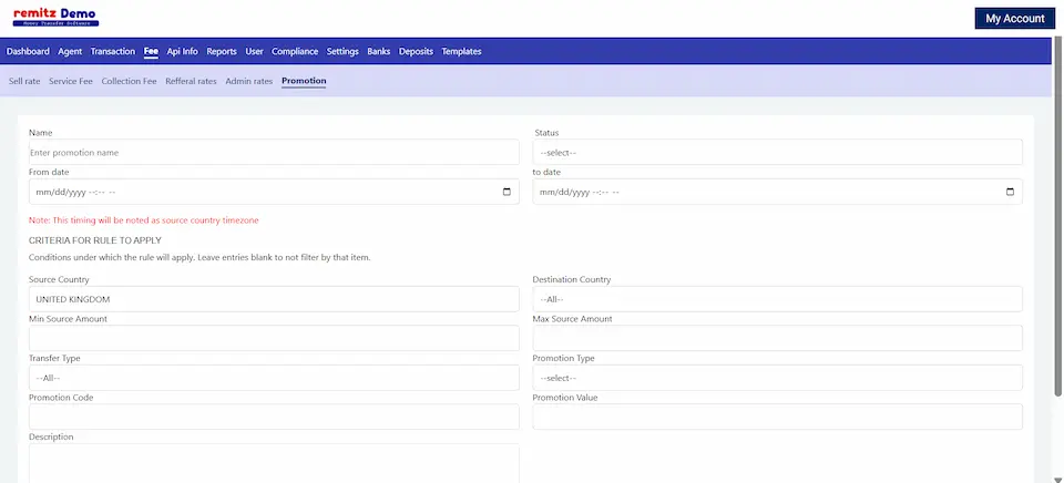 The service fee can be set here based on the corridors. The service fee here can be set in such a way that it be set as a percentagw fee or flat fee.
